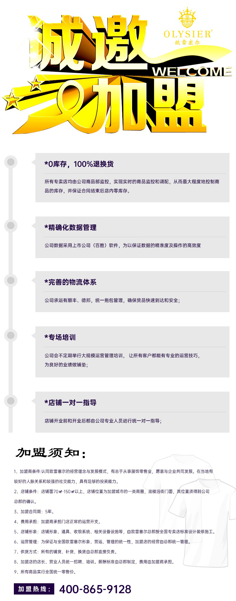 深圳市欧雷塞尔服饰有限公司地址:深圳市龙岗区龙城街道龙岗大道2284号三楼电话:400-865-9128邮箱:2790481162@qq.com网址:www.olysier.cn